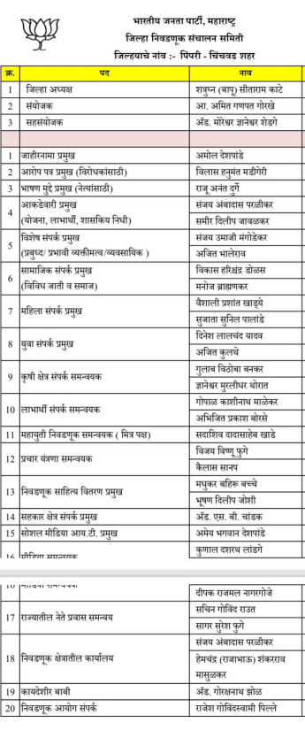 भाजप पिंपरी चिंचवड जिल्हा निवडणूक संचालन समिती जाहीर