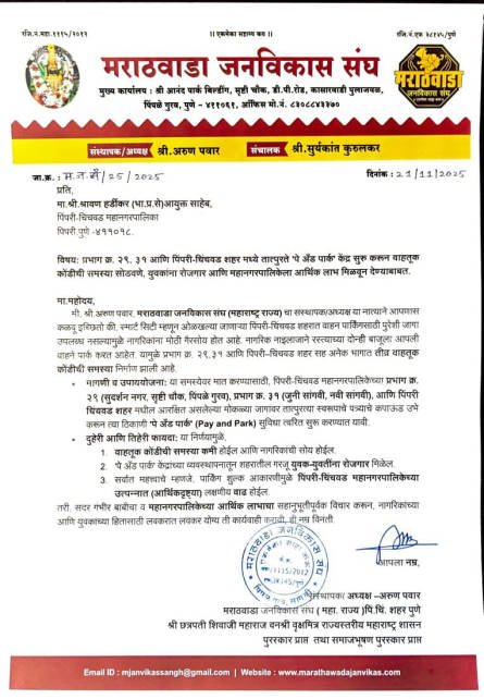 निवेदनात म्हटले आहे, की स्मार्ट सिटी म्हणून ओळखल्या जाणाऱ्या पिंपरी-चिंचवड शहरात वाहन पार्किंगसाठी पुरेशी जागा उपलब्ध नसल्यामुळे नागरिकांना मोठी गैरसोय होत आहे. नागरिक नाइलाजाने रस्त्याच्या दोन्ही बाजूला आपली वाहने पार्क करत आहेत.