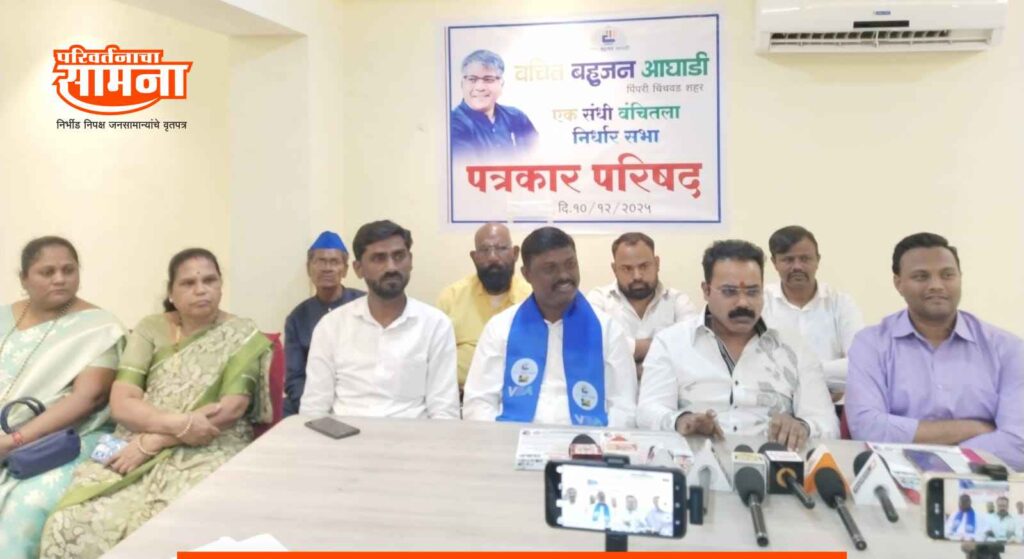 पिंपरी चिंचवड (ऑनलाईन परिवर्तनाचा सामना) (प्रतिनिधी) दि.१० डिसेंबर २०२५ – पिंपरी चिंचवड महानगरपालिकेच्या आगामी निवडणुकीच्या पार्श्वभूमीवर वंचित बहुजन आघाडीतर्फे आयोजित ‘एक संधी वंचितला’ ही भव्य निर्धार सभा शहरात रंगणार आहे. सुर्यपुत्र भय्यासाहेब आंबेडकर यांच्या जयंतीनिमित्त होणारी ही सभा राजकीय वातावरण तापवणारी ठरणार असून या सभेला वंचित चे सर्वेसर्वा ऍड बाळासाहेब तथा प्रकाश आंबेडकर उपस्थित राहणार आहेत. सभा शुक्रवार दिनांक १२ डिसेंबर २०२५ रोजी पिंपरी येथील डॉ बाबासाहेब आंबेडकर पुतळ्याच्या (भीमसृष्टी)मागील मैदानात होणार आहे.या सभेमध्ये वंचित बहुजन आघाडीच्या वतीने निवडणुकीचे बिगुल फुंकल्या जाणार असल्याचे स्पष्ट संकेत शहराध्यक्ष नितीन गवळी यांनी दिले.पिंपरीतील हॉटेल नमस्कार येथे (दि.१०) पत्रकार परिषदेत ते बोलत होते.